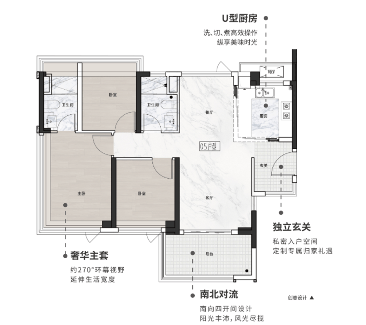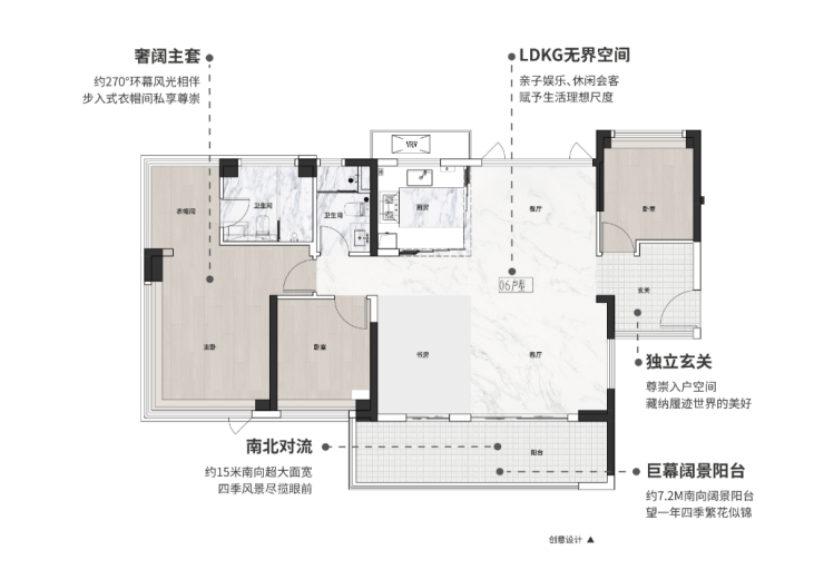 餐客厅一体化设计,连通约7.2米南向阔景阳台,亲友聚会无压力;主卧带步入式衣帽间,私密性更佳。