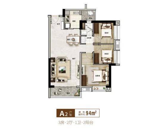 户型方正,标准的三房两厅一卫户型,三个卧室都有做飘窗,同时为了尽可能增加卧室面积,户型牺牲了一些走廊的面积,导致走廊有些狭窄。