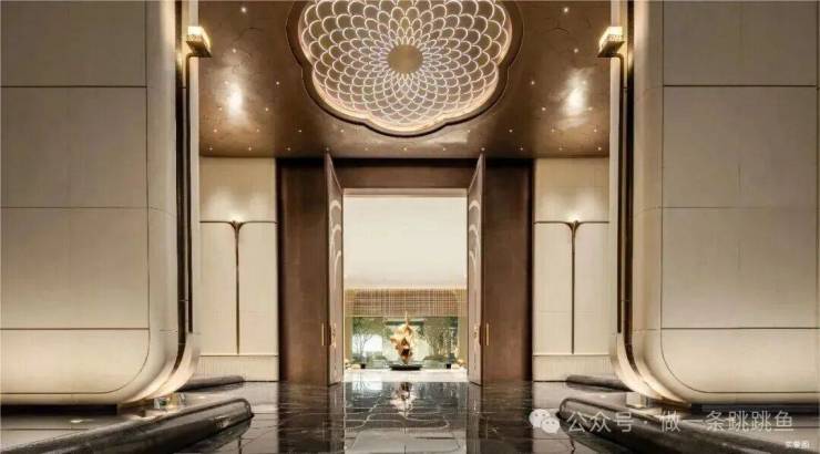 每一步都有故事,每一隅皆具巧思。入门伊始,高9米黑金奢石照壁,分5片屹立其间,含“九五至尊”之意。