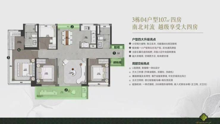 是个南北对流的户型,四开间朝南。南面做了宽阳台的设计,加上花池的赠送,空间阔绰;北面餐厅报备了花池,可做餐边柜摆放杂物形成对流。