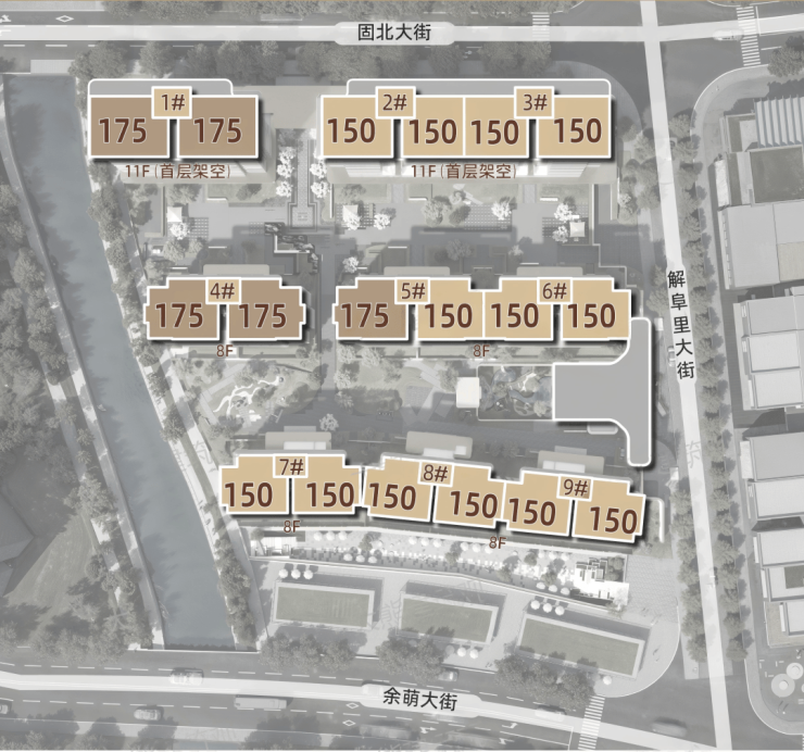 产品:8-11层板式洋房,150-175平,顶层200-300㎡复式