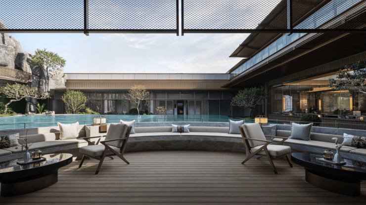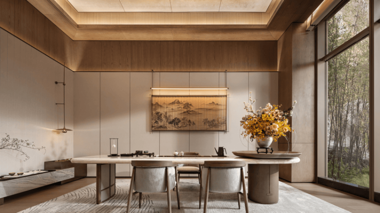 项目以东方美学为造园基调,取千古名画《千里江山图》中“游、聚、乐”三处生活场景打造三大核心院落,并精心打造“极境归心”“平湖叠瀑”“曲水流觞”三进制归家仪式,成就一方具有人文内涵的当代东方学府住区。