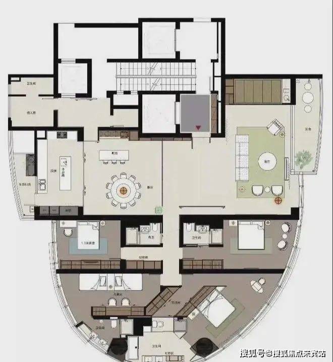 因为建筑本身结构关系。在空间布局上,我们更多的考虑到公共区域,主卧室及小孩房的布局