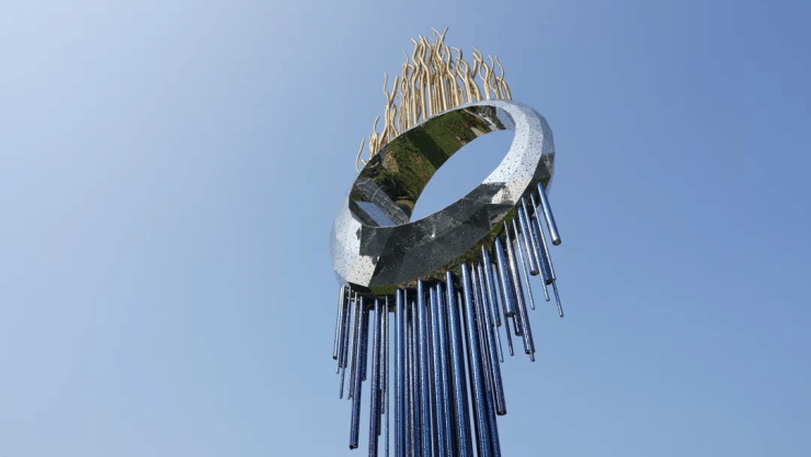 香江1号·未来之眼雕塑高 9.8 米,巍然屹立于大湾区香江1号,是联合国首任 “环保艺术大师”、全球顶尖雕塑家袁熙坤先生创作的艺术地标。作品以不锈钢锻造,其艺术构思源于对未来文明图景的深刻洞察,也与所在场域香江1号“跨越,定义未来”的精神内核相呼应。