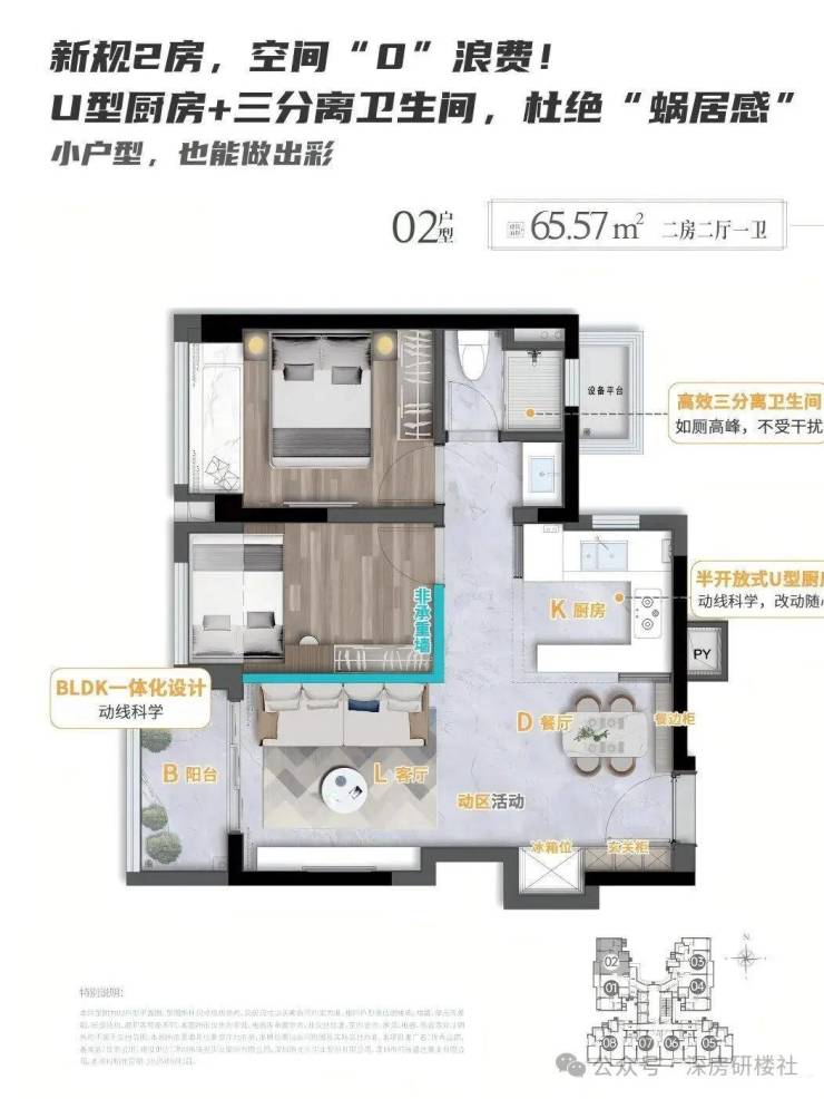 建面约65㎡的两房两厅一卫,共计4款户型,属于南山极度稀缺的产品。