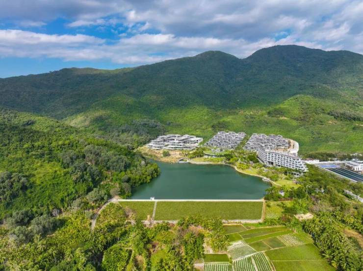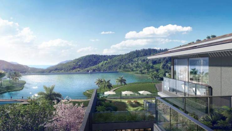 新湖·海棠春晓位于海棠湾南片,铁炉港内海西岸,白石岭万亩热带雨林环抱,内含蓝月湖(原高村水库),海洋、森林、山峦、湖泊在此一望尽收。园区建筑依约60米自然地势高差精妙排布,确保每一席墅品或傍山、或观湖、或瞰海……
