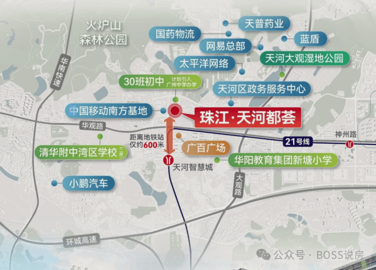 地铁:距离地铁21 号线天河智慧城站仅约 600 米,通过快线 3 站可到达金融城,5 站直达珠江新城,还可便捷换乘地铁 11 号线、13 号线二期(在建中)。