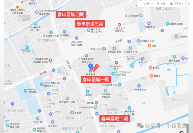 交通方面,「春申景城」距离15号线约2公里。周边高架有S20外环高速,S4沪金高速,虹梅高架路等,主干路纵有莲花南路,横有春申路,自驾非常便捷。