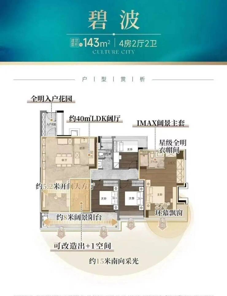 建面约128㎡的四房,则做到约16米南向采光、南北对流,且拥有一个约40㎡LDK阔厅,碾压市场同面积产品。