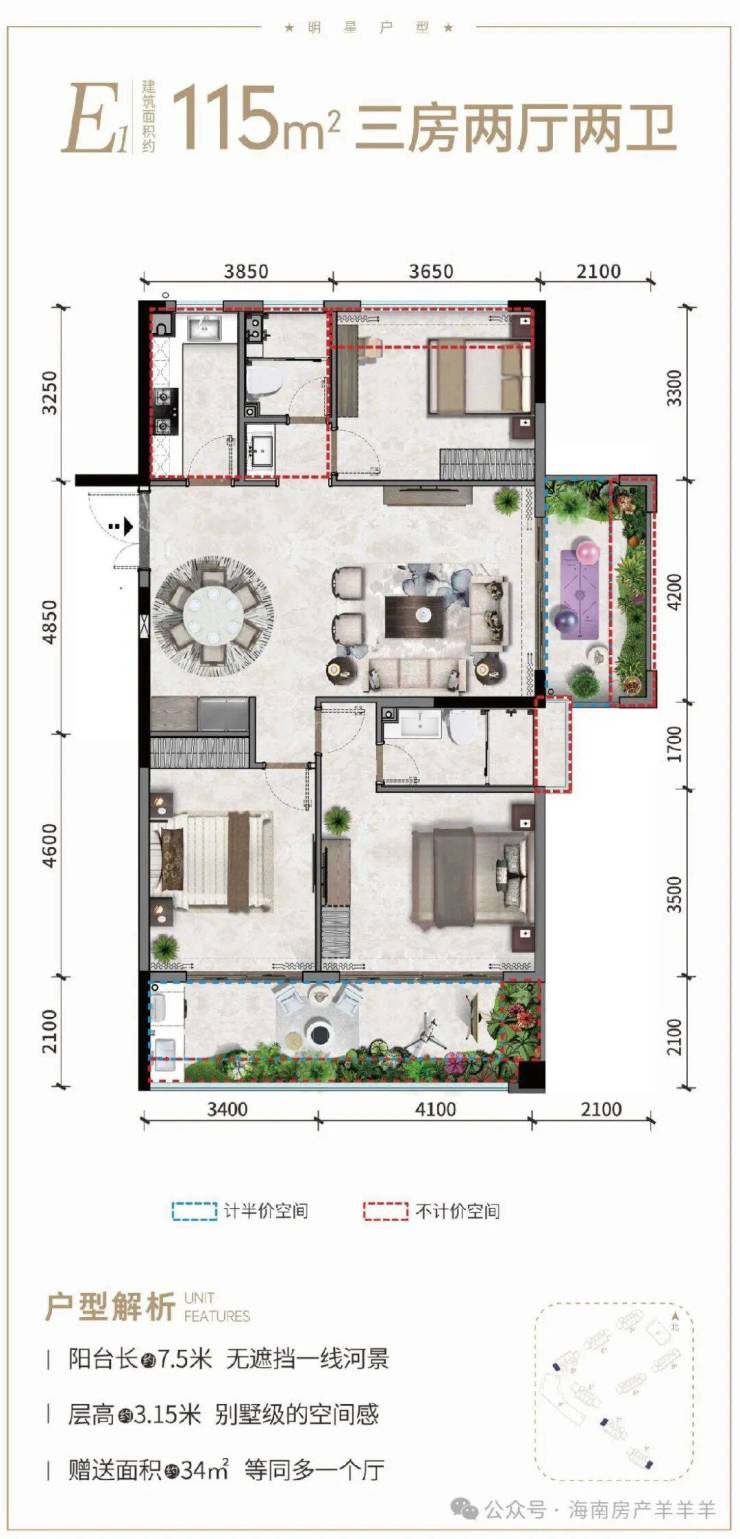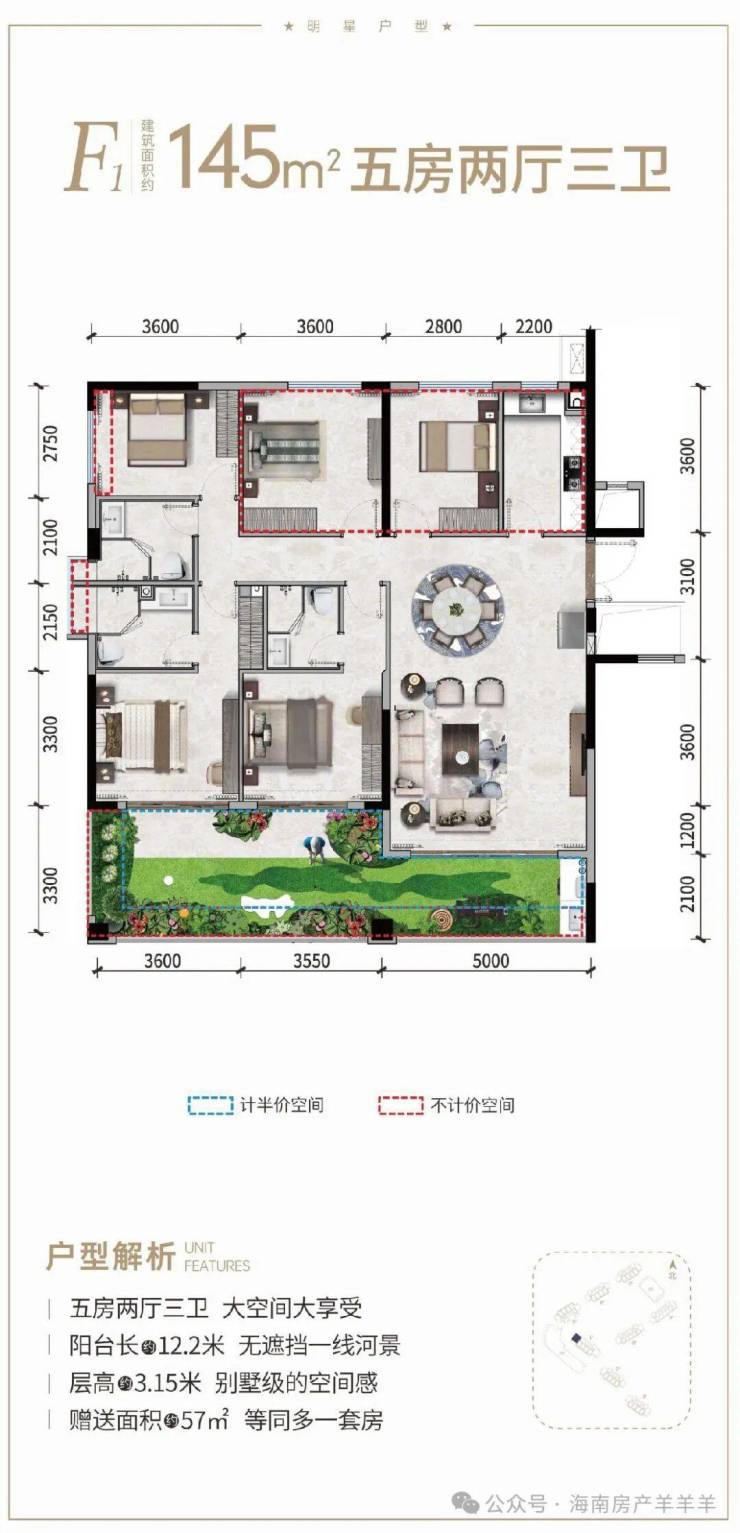 ②产权式酒店,户型南北通透,面积93-145㎡两房至四房。赠送超大面积,93㎡两房一卫、97㎡小三房两卫、115㎡三房两卫、141㎡四房三卫;阳台面宽高达12米,部分阳台可270°三面河景。