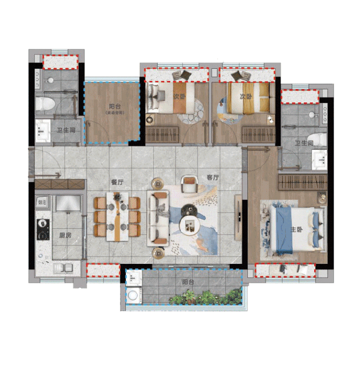 建面约96平3+1房更为惊艳。同样是时尚大气的横厅设计,搭配餐厅的飘窗及超大阳台,一派大户人家的即视感。纯南的黄金朝向,全屋超大飘窗设计,每一个空间都能实现真正的南北对流,通透明亮,舒适性堪比大平层。