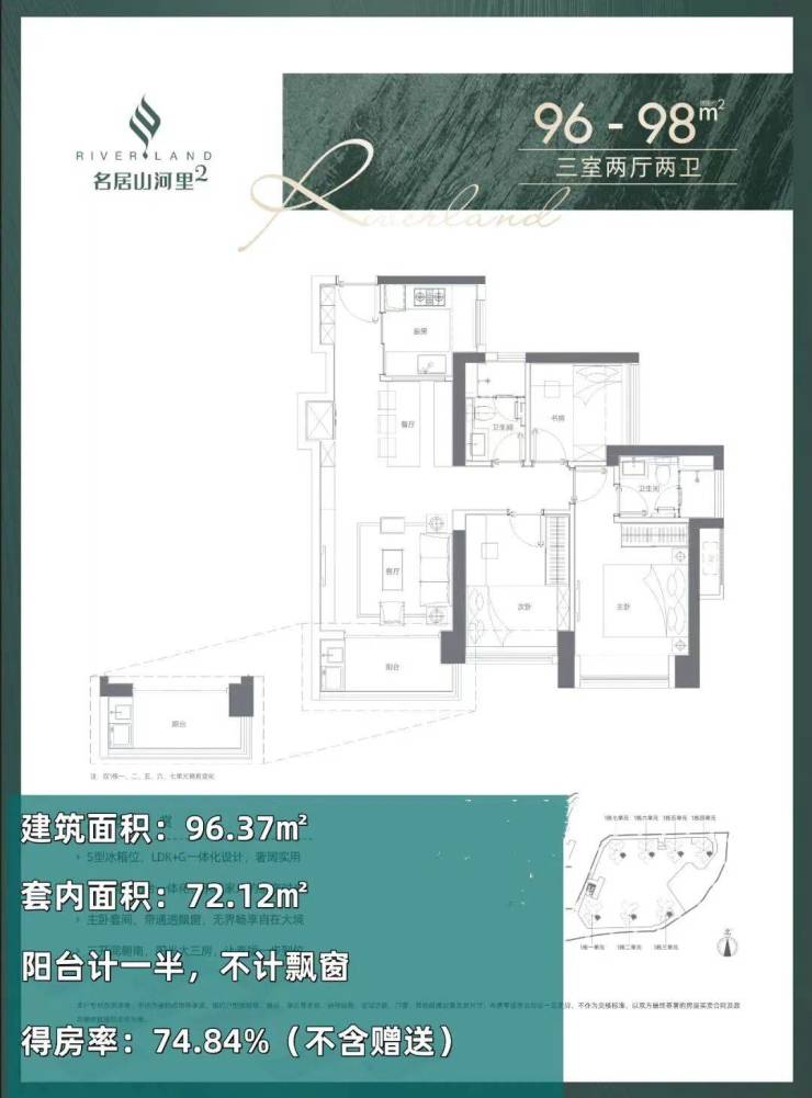 96-98㎡的3房2厅2卫(05户型),设计的是经典竖厅格局,餐客厅一体化,客厅3.5米开间,S墙设计预留冰箱位,三开间朝南,U型厨房,得房率:74.84%(不含赠送),阳台1.5米进深,东南朝向。