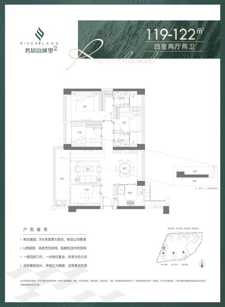 119-122㎡的4房2厅2卫,设计的是竖厅南北通透格局,客厅3.8米开间,四开间朝南,全屋飘窗,U型厨房,得房率:74.83%(不含赠送),阳台1.5米进深,6米长超大阳台,主朝西南向。