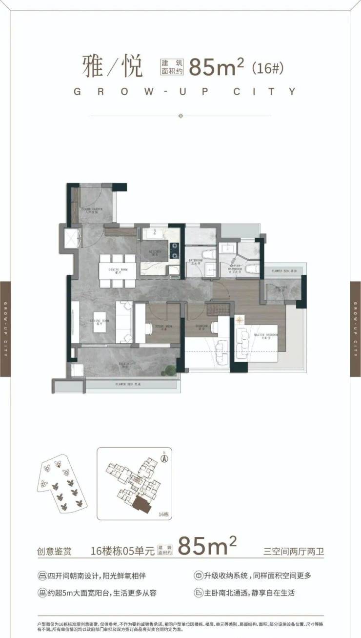 85㎡三空间两卫,三口之家一步到位,一期断货王PLUS 南向4开间 约11.1m采光,双进私密玄关 5.4m跑道式阳台,主卧270°无立柱景观飘窗 阳光衣帽间 。