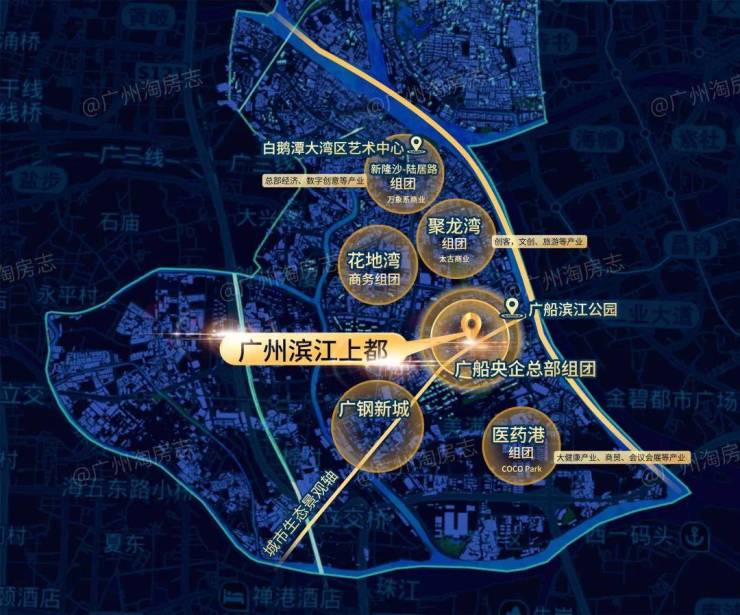 项目紧邻珠江,拥有约2公里长的江岸线,并计划打造一个总建筑面积约125万平方米的城市综合体,涵盖大型商业中心、企业总部基地、星级酒店、滨江公园、文化艺术设施、教育医疗配套以及高端住宅等八大业态。