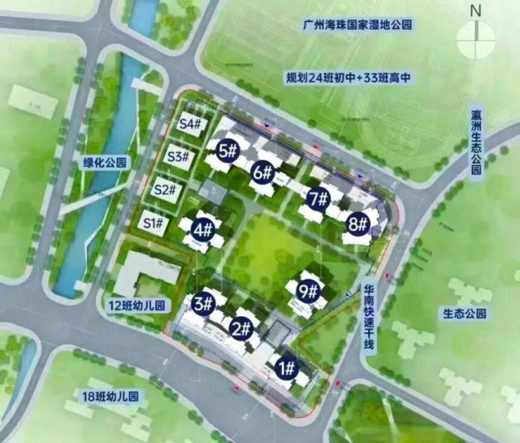 医疗和生态资源是项目的一大亮点,周边 3 公里内有中山大学孙逸仙纪念医院、中山二院海珠院区等三甲医院,日常就医很方便。项目北邻海珠国家湿地公园,这个占地约 1100 万平方米的 "城市绿肺",能让居民日常散步、休闲有好去处,部分高楼层房源还能直接看到湿地景观,生态环境确实优越。