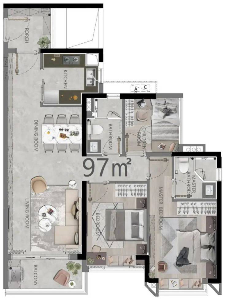 C 户型则多了个入户花园,厨房操作台更大,不过采光相对弱一些,购房者可以根据自己对阳台和采光的需求选择。这个面积段的户型动静分区明确,次卧空间刚好能放下儿童床,适合三口之家长期居住。