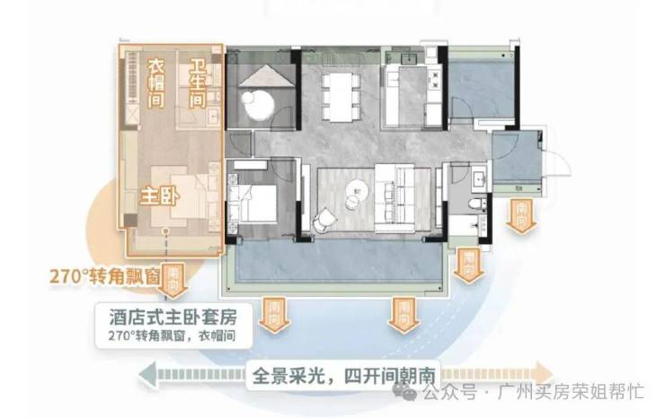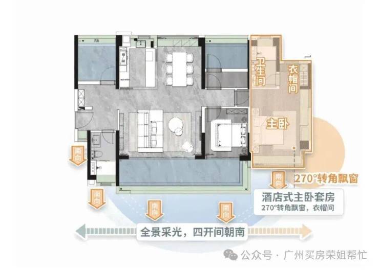 🔘主卧套间,配置衣帽间、270°大飘窗