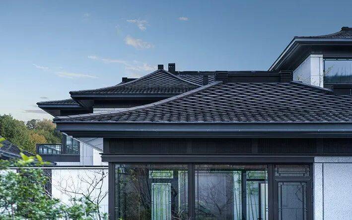 屋面瓦部分,将传统的小青瓦与筒瓦加以解构、变化,呈现出独特的肌理效果。纵向排列的瓦片让屋面过渡平滑连续,建筑更显挺拔,同时牵引视线向更高远的空间。