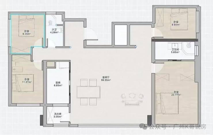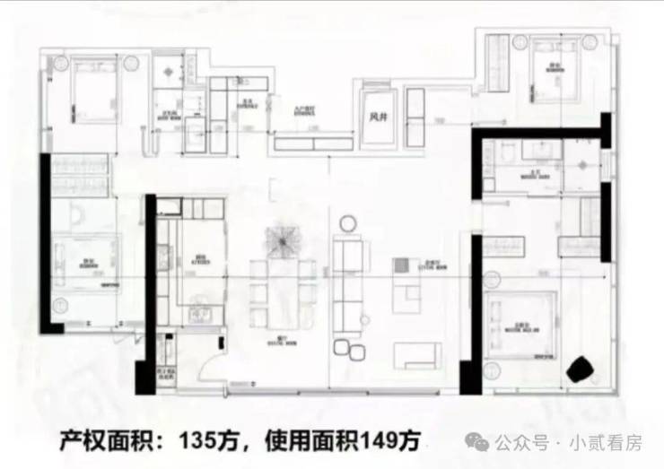 133㎡大平层,四叶草+横厅设计在广州独一无二,客厅甚至不需要打通,就能实现约7.4米大宽厅,媲美170㎡大平层。