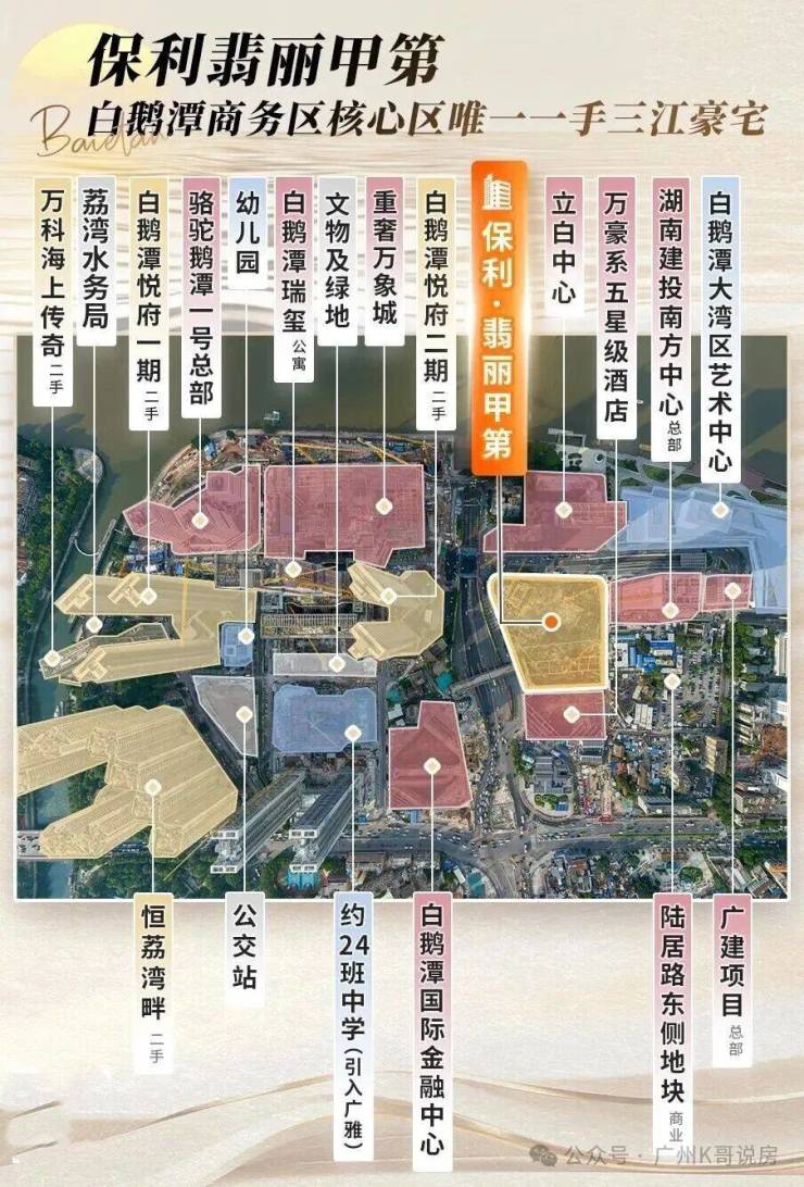 这一地块地处白鹅潭商务区核心区,三江交汇处,周边商业、交通、人文、教育、医疗配套一应俱全,在建的双重奢商业地标——广州万象城、聚龙湾太古里,未来必将为白鹅潭带来非凡体验。