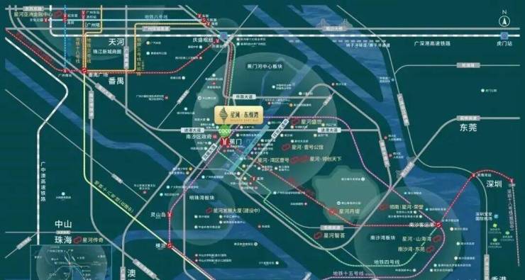星河·东悦湾位于南沙蕉门中心区,地铁4号线蕉门站旁,背靠大山乸森林公园,面向蕉门河,项目为规模达92万㎡的城市综合体,自带9.7万㎡情景式购物中心COCOPark,填补南沙高端购物综合体;