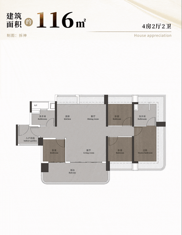 约116平四房,可能是万博最好的湖居三代居户型: