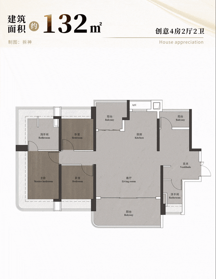 约132平四房,直接就是全景大宅风范: