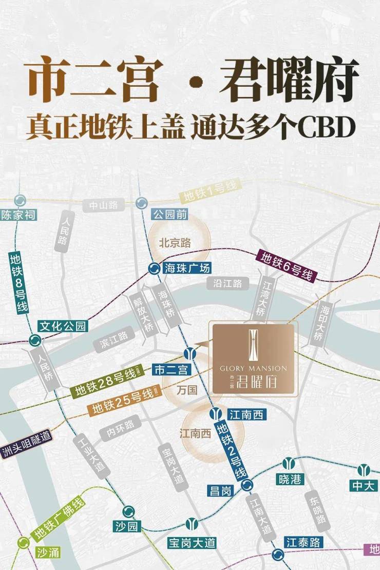 君曜府于2/28号线(广佛段在建中)交汇点市二宫站上盖,2号线畅连北京路、万国、江南西等多个商圈,快速通达珠江新城琶洲等CBD,出行相当高效。