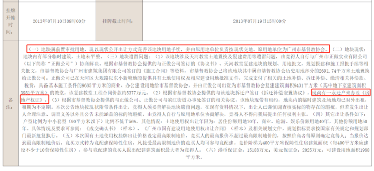 原来,这地块原用地单位为广州市基督教协会,招拍挂时地块仍涉及天河教堂土地置换及复建费用、带租约的临时建筑等遗留问题,且地块内尚有未办妥拆迁补偿协议也待协商解决。