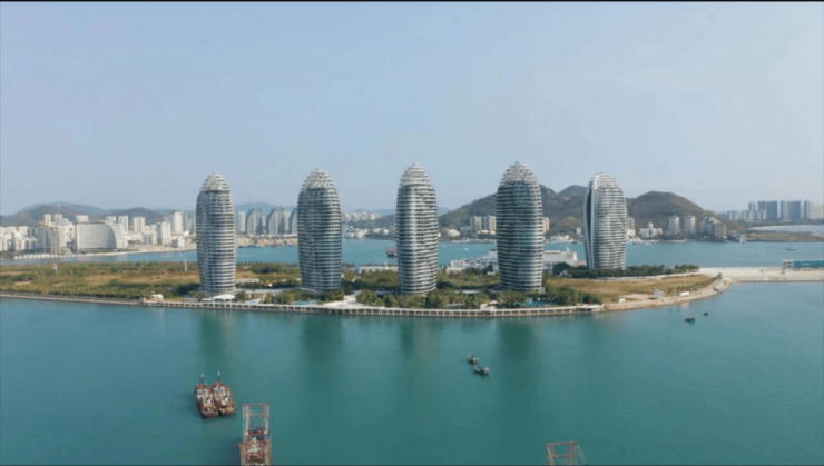 中交凤凰岛,整岛总面积约36.5公顷,规划总建筑面积约40万㎡,其中已开发用地约6.4公顷,已建建筑面积约8.4万㎡,目前已建成5栋100米地标建筑群,一座8万GT邮轮母港码头。
