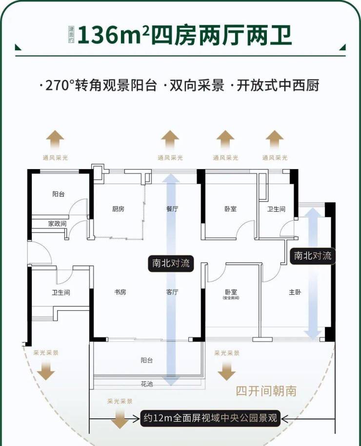 其次,是纯板楼设计,100%南向布局,南北对流。且南向前两排均是小高层,楼间距1.3:1,前后宽阔无遮挡,阳光可以肆无忌惮入室。