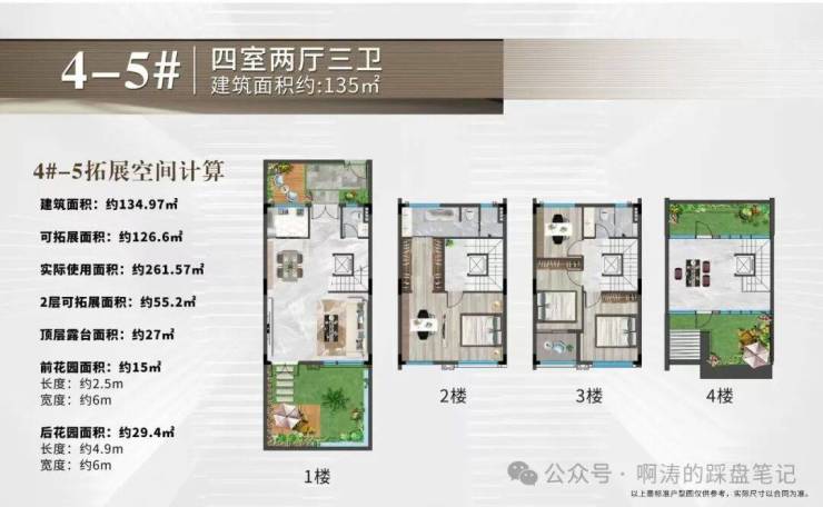 可拓展空间极大,可实现3+1层高拓空间,以4-5#为例,建筑面积约134.97㎡,总拓展约126.6㎡(其中室内约55.2㎡、前后花园约45㎡、顶楼露台约27㎡),实得率194%。