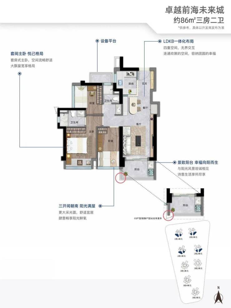南向采光:约86㎡三房两卫实现三开间朝南,约113㎡四房两卫实现五开间朝南,全明通透