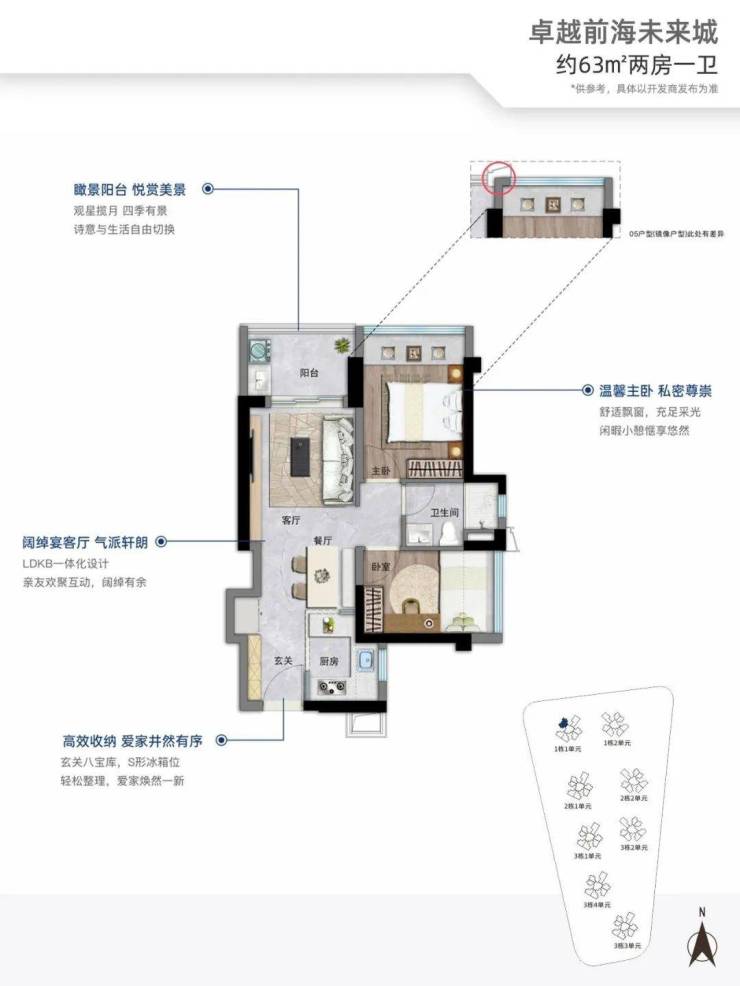 前海未来城一期户型建筑面积约63-113㎡二至四房,为2024年新规户型,秉承以人为本,赋予空间实用、社交、想象特质,满足城市新中产精英对家的精致追求。