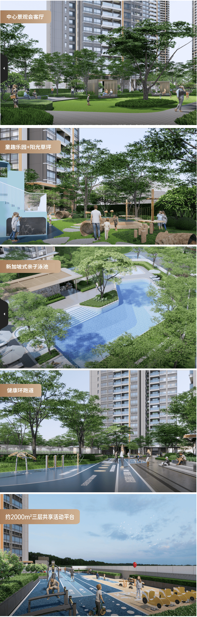 约4.2万㎡都市全龄乐活园林,以“两轴三带+多重花园”造园理念,打造包含景观会客厅、儿童活动、度假泳池、静谧花园、宠物乐园等8大景观园林亮点,打造全生命周期生活场景。