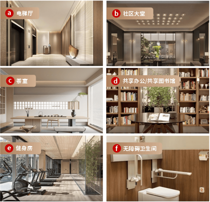 社区会所:精装社区接待大堂,嵌入茶室、共享办公/图书馆、健身房等多功能空间,打造社区品质格调的邻里交流天地。