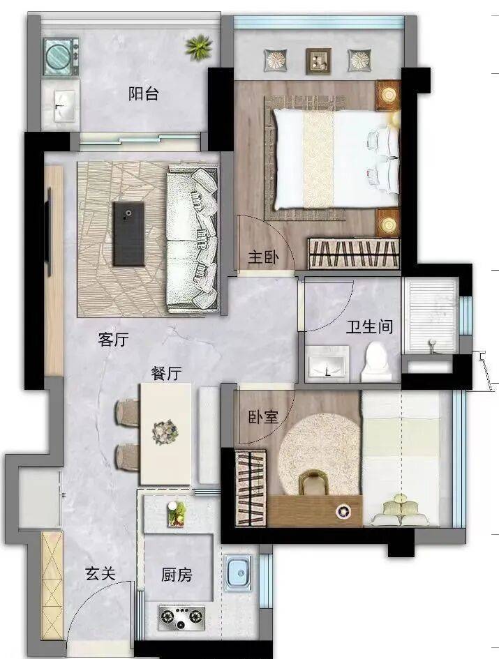 约63㎡2房2厅1卫:竖厅设计,进门入户玄关,S墙设计预留冰箱位,U型厨房,餐客厅一体连接阳台,卫生间干湿分离,阳台西北朝向。