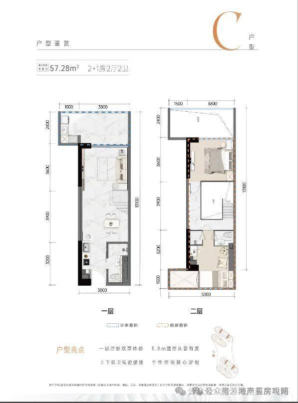 C户型:建筑面积约57.28㎡,2+1房2厅2卫↓