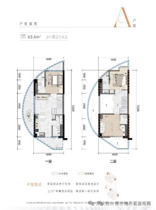A户型:建筑面积约63.6㎡,3+1房2厅4卫↓