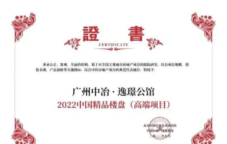 2022年7月7日,中冶 · 逸璟公馆荣获中指院“2022中国精品楼盘TOP1(高端项目)”。