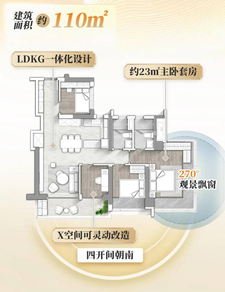 215㎡大平层,3梯3户,带超大入户前室,拥有约9.6米南向大景观阳台,和主卧270°观景飘窗,看园林景观。