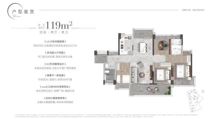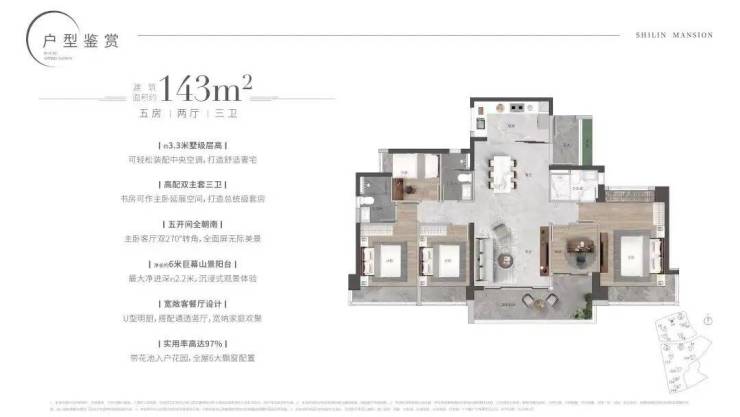 约3.3米墅级层高,高配双主套三卫,五开间全朝南,主卧客厅双270°转角,净长约6.3米巨幕山景阳台,最大净进深约2.2米,实用率高达97% 带花池入户花园,全屋6大飘窗配置。