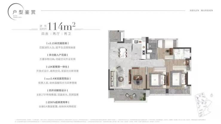约3.15米优越层高,净长约5.4米双面宽阳台,四开间朝南设计,主卧270°转角飘窗,双面采光,宽屏园景,达96%超高使用率,长岭居首个约80cm飘窗产品,全屋6大飘窗。