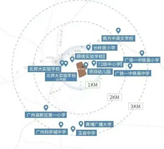 项目自建12班幼儿园,一路之隔有72班中小学(建设中)。距离最近的小学一是长岭居小学南校区,还有直线距离约3公里内有北京师范大学广州实验学校小学部、广铁一中铁英中小学、颐境实验学校(建设中)等优质学校。