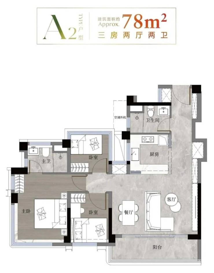 (1)78㎡三房做到5.5米宽厅+120%使用率,通过“餐厅置换客厅空间”的创新设计,将传统120㎡户型的大方厅压缩至小面积段,满足年轻家庭对公共空间的需求;