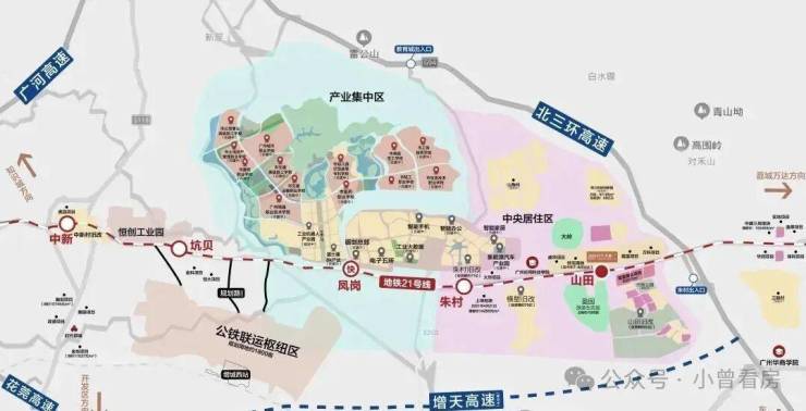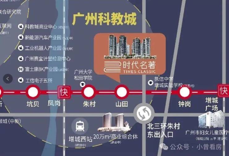 项目所宣传的“地铁3站到黄埔”,是指从山田站坐到凤岗站,再换快线到达黄埔知识城的镇龙站,耗时约14分钟;“5站到天河”,是指到天河大观南路站,耗时约38分钟。
