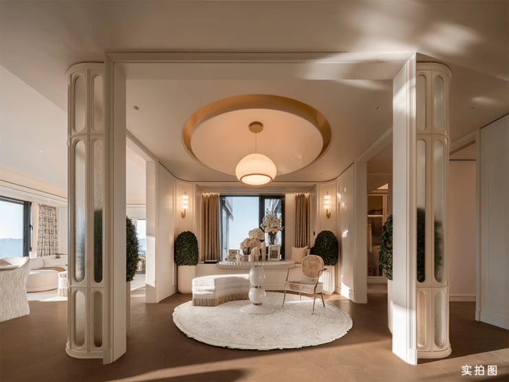 为了让景观与光线最大化进入室内,全景舱户型搭配0.6黄金窗墙比(远超常规住宅 0.3-0.5 的标准)——大面积玻璃幕墙取代传统墙体,不仅让建筑外立面呈现出 “水晶盒子” 般的轻盈质感,更让室内空间实现 “全明通透”:客厅无需依赖灯光,白天也能保持明亮;卧室即使在阴雨天,也能透过玻璃引入柔和的自然光线;就连厨房、卫生间等区域,也通过小尺寸玻璃窗设计,避免“暗厨暗卫” 的压抑。