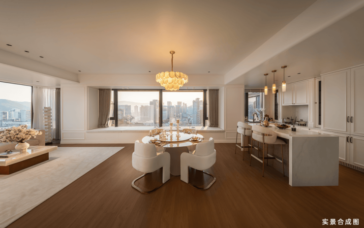 全景舱户型以LDKB一体化设计,重构家的融合场景。客餐厅、厨房与阳台流畅衔接,消隐传统空间的功能边界。以约187㎡户型为例,客餐厅进深超7.3米,配合中西双厨与岛台布局,形成通透而连贯的整体场域。备餐时目光可及客厅嬉戏的孩童,岛台旁自然成为家人交谈、朋友聚会的温馨据点。客厅、餐厅与阳台彼此延伸,营造出开阔而包容的社交氛围。这不仅是一处居所,更是情感紧密联结的所在——让互动自然而然,让家回归温暖的本真。