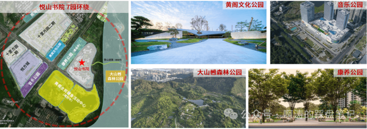 包括文化公园、音乐公园、康养公园(建设中)、全民健身活动中心(规划中)、体育公园、大山乸森林公园、南湾公园,共同营造自然、人文、宜居生态的现代东方书院式人居环境。